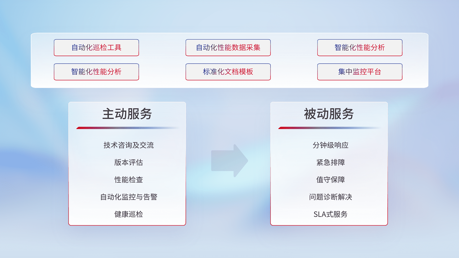 智能化工具和标准化文档,,,保障服务质量,,提供主动服务(包含技术咨询、、版本评估、、性能检查、、、自动化监控与告警、、、、健康巡检)和被动服务包含(分钟级响应、、、、紧急排障、、、、值守保障、、、问题诊断解决、、、、SLA服务)。。。。